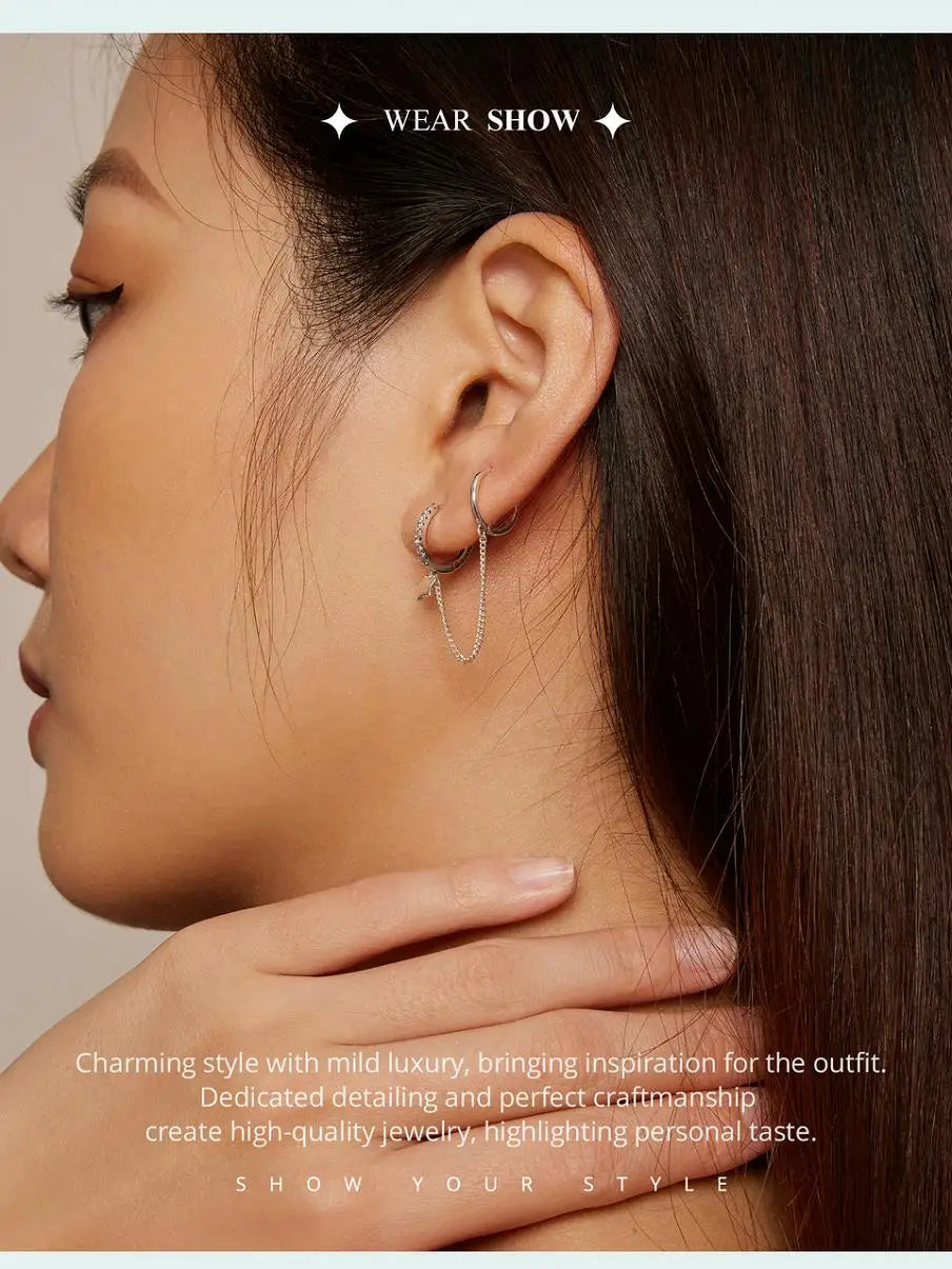 Zircon Stud Earrings with Chain – 925 Sterling Silver Double Hoop
