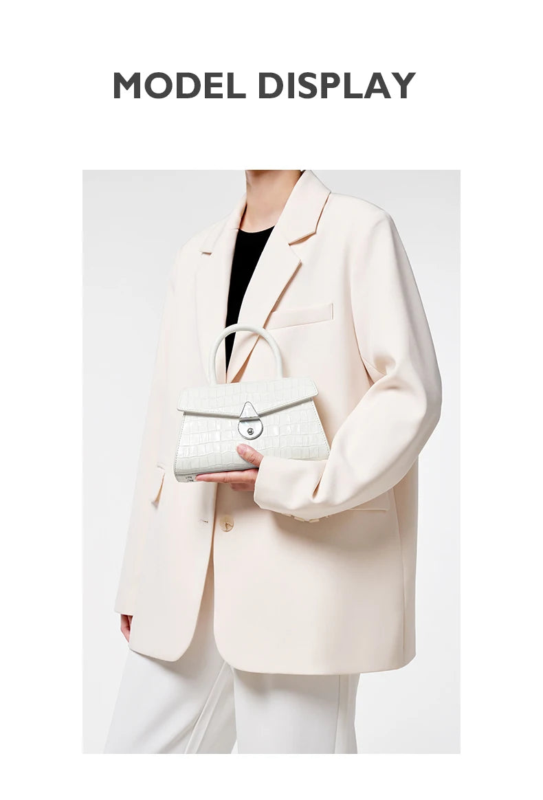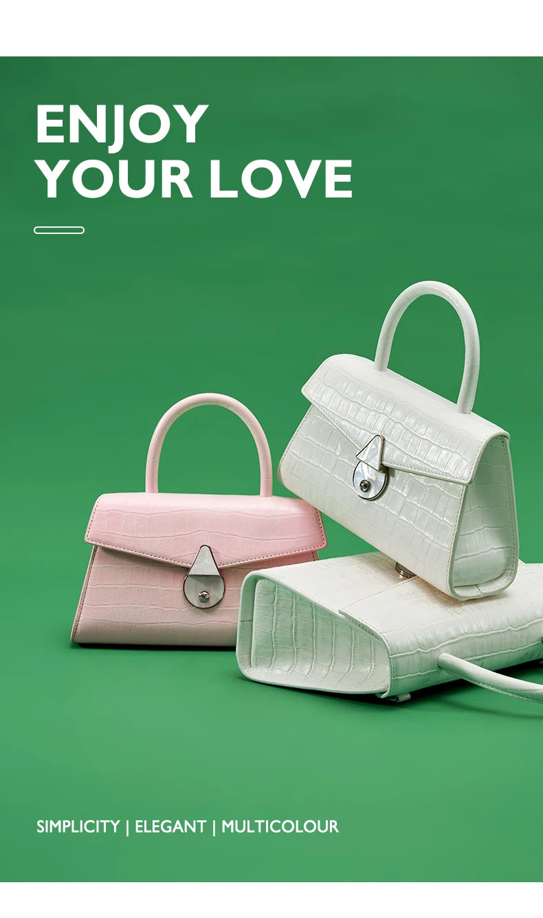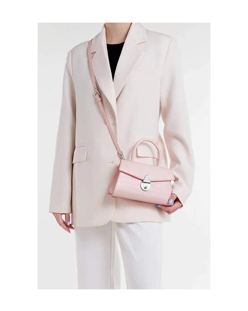 | Features | Structured body, animal print, flap pocket, lock closure |