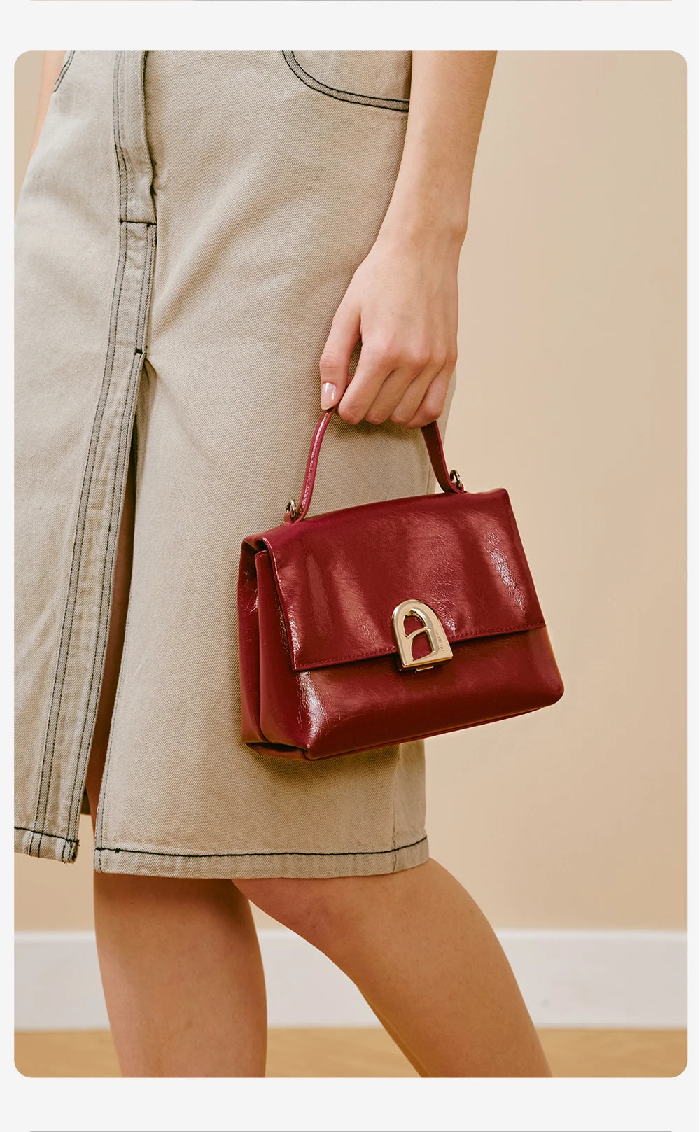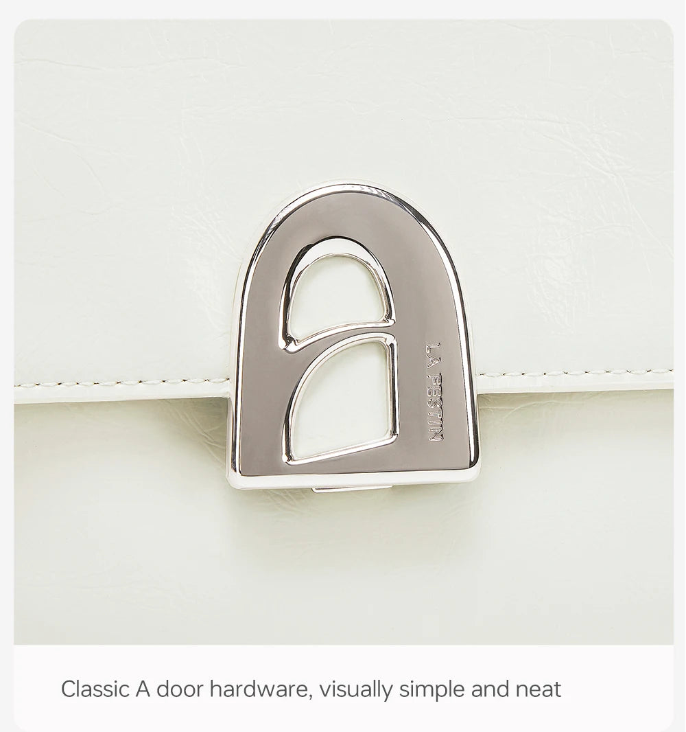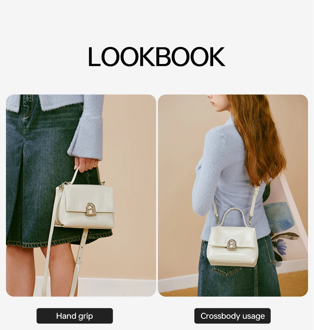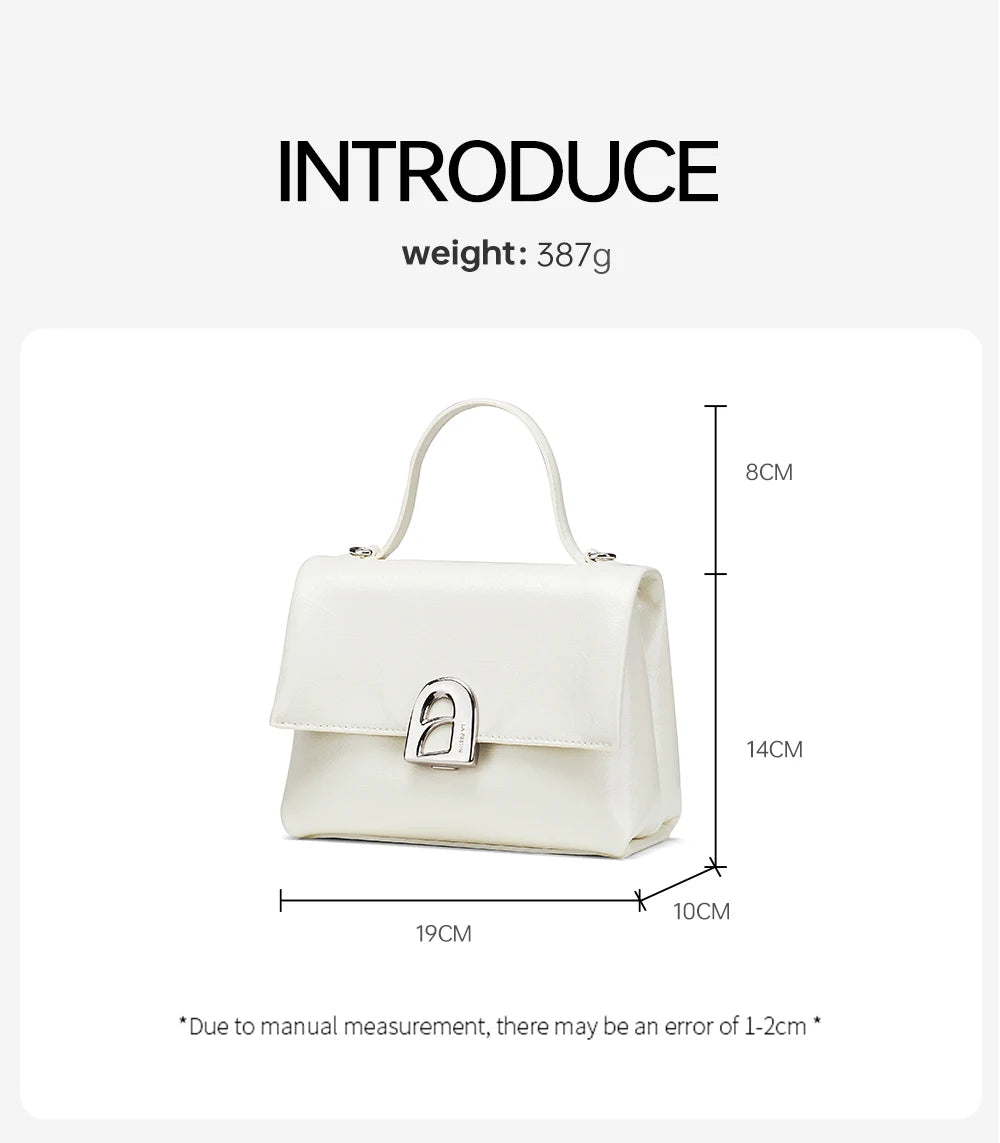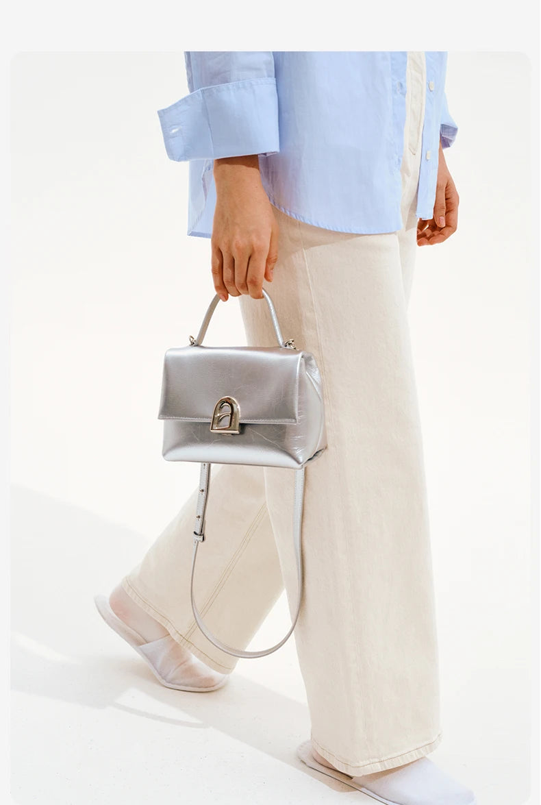 A compact square tote crafted from split leather, offering a soft structure and a clean everyday profile designed for women.